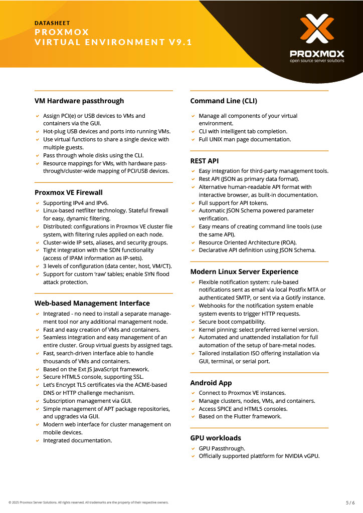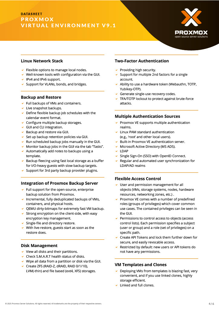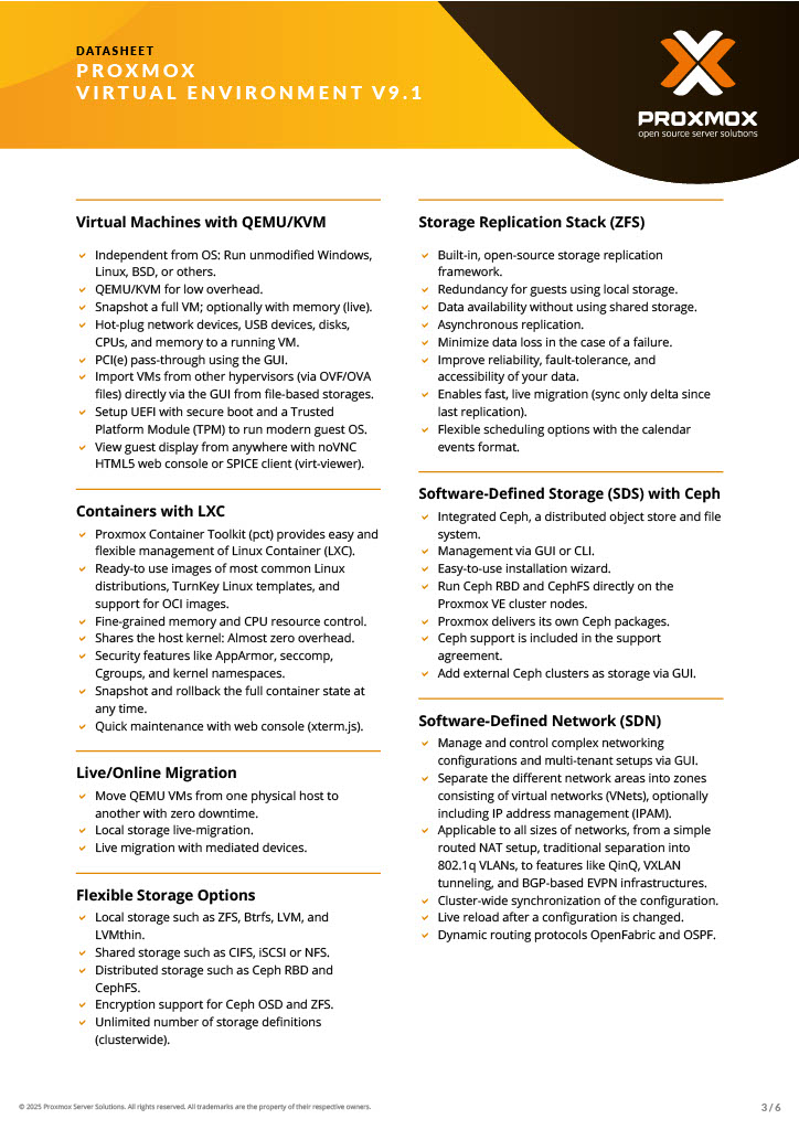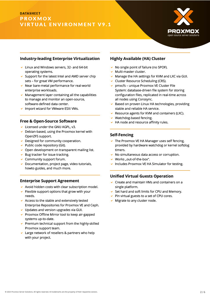Proxmox Produkte ermöglichen es Unternehmen weltweit, flexible Virtualisierungslösung für Server quelloffen, sicher und kostengünstig einzusetzen. Proxmox vereinfacht die Bereitstellung und Verwaltung von virtuellen Maschinen und Containern in einer zentralen, web-basierten Oberfläche, inklusive Speicher- und Netzwerkverwaltung sowie Hochverfügbarkeit. Eine vollständige Open Source Plattform für Virtualisierung (KVM), Container (LXC) und Clustering – alles in einer Plattform.
